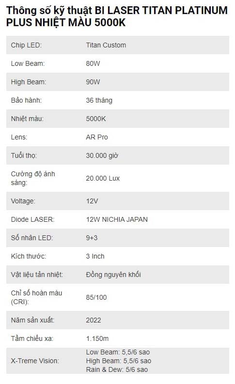 Bi LASER Titan Platinum Plus được trang bị hệ thống 12 nhân led Titan Custom với 9 nhân led ở chóa phản xạ chính và 3 nhân led ở chóa phản xạ phụ cùng với 1 diode laser 12W cho ra cường độ ánh sáng mạnh mẽ với công suất ở chế độ Cos: 80W và công suất ở chế độ Pha: 90W.