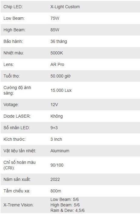 Trang bị hệ thống 12 nhân led X-Light Custom, bao gồm 9 nhân led được đặt ở chóa phản xạ chính và 3 nhân led đặt ở chóa phản xạ phụ cho ra cấu hình ánh sáng mạnh mẽ với công suất Cos (Low Beam) đạt 75W, công suất Pha (High Beam) là 85W.